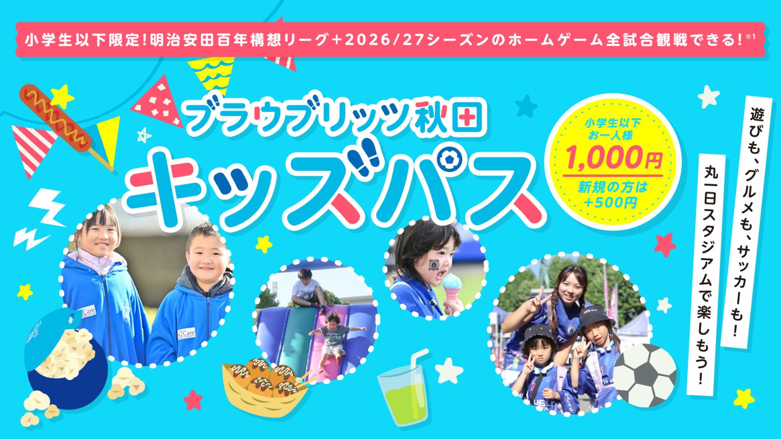 小学生以下限定「キッズパス」 申し込み受付中! ブラウブリッツ秋田では、秋田県内の小学生以下の皆様に明治安田百年構想リーグ+2026/27 シーズンの全ホームゲームが観戦できる「キッズパス」を実施いたします。 ぜひ、キッズパスをお申込みいた … 続きを読む 小学生以下観戦無料!「ソユー Presents キッズパス」申し込み受付中!