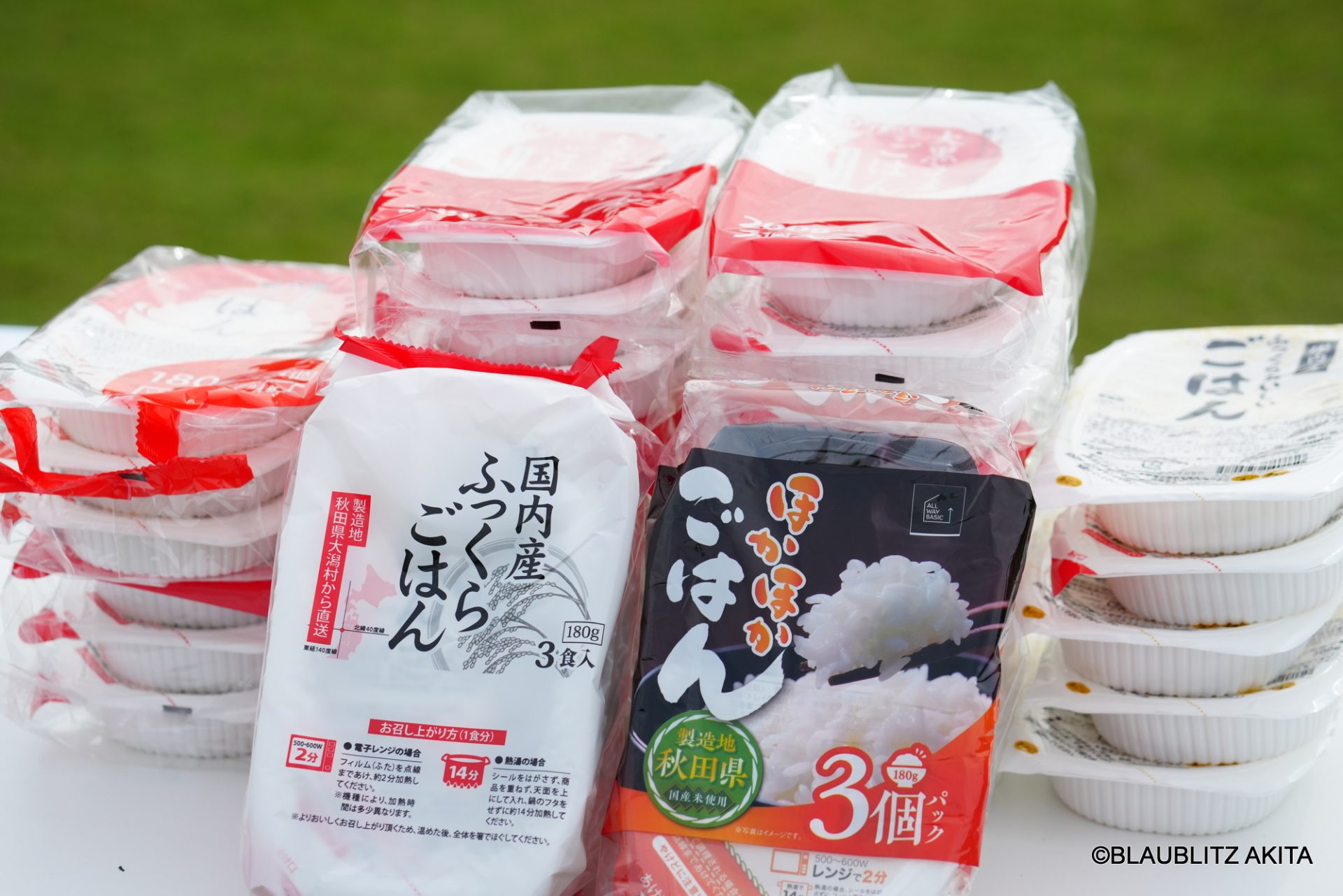 ジャパン・パックライス秋田様ではOEMにてプライベートブランドの商品を生産しており、梱包の段ボールに入りきらない端数分を福祉施設や子ども食堂などに寄付されており、今回ブラウブリッツ秋田クラブハウスにも寄付をいただく運びとなりました。