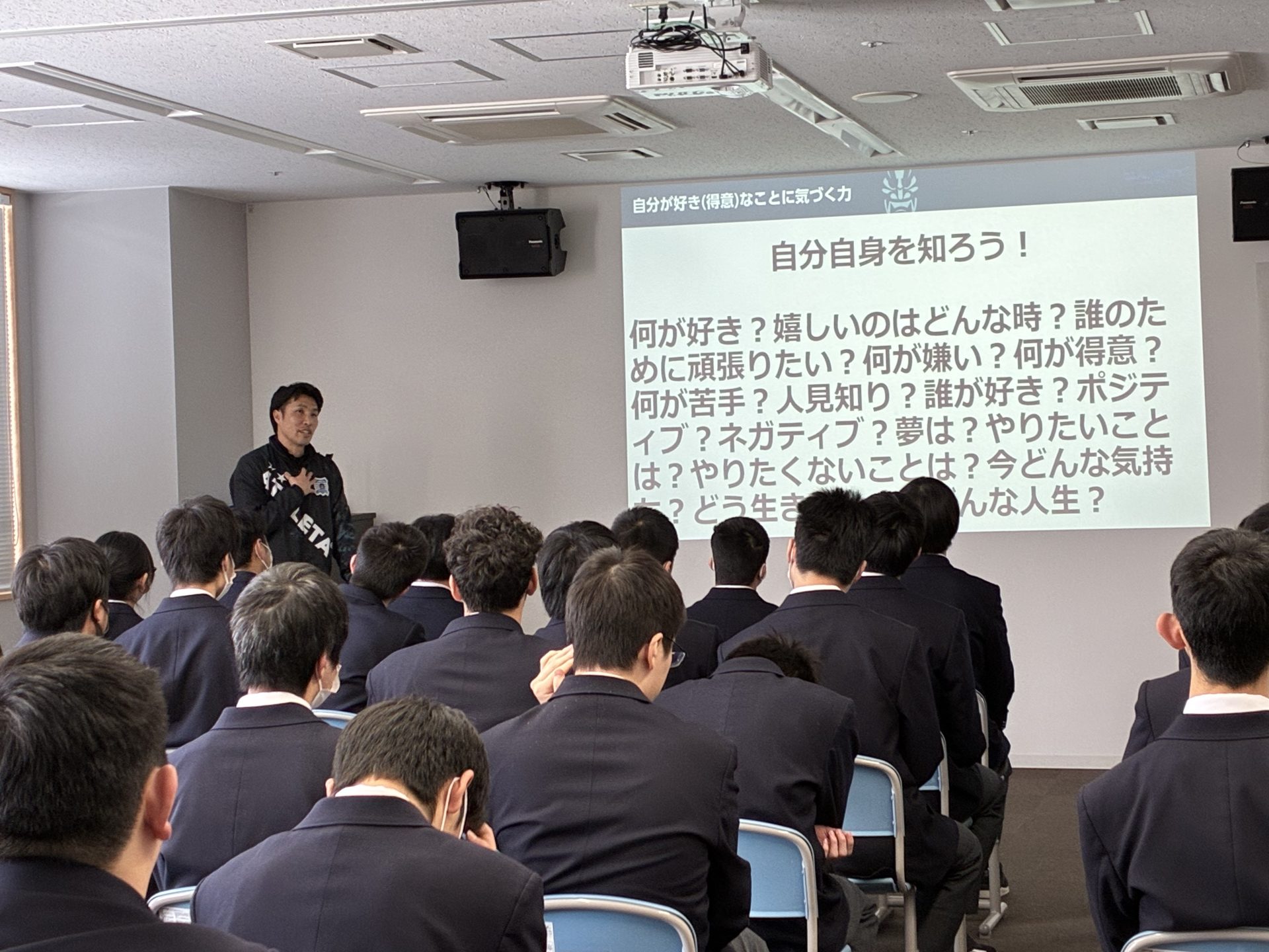 はじめに、これから社会に出て仕事に就く前に、自分自身のことを深く知ることの大切さについて伝えました。