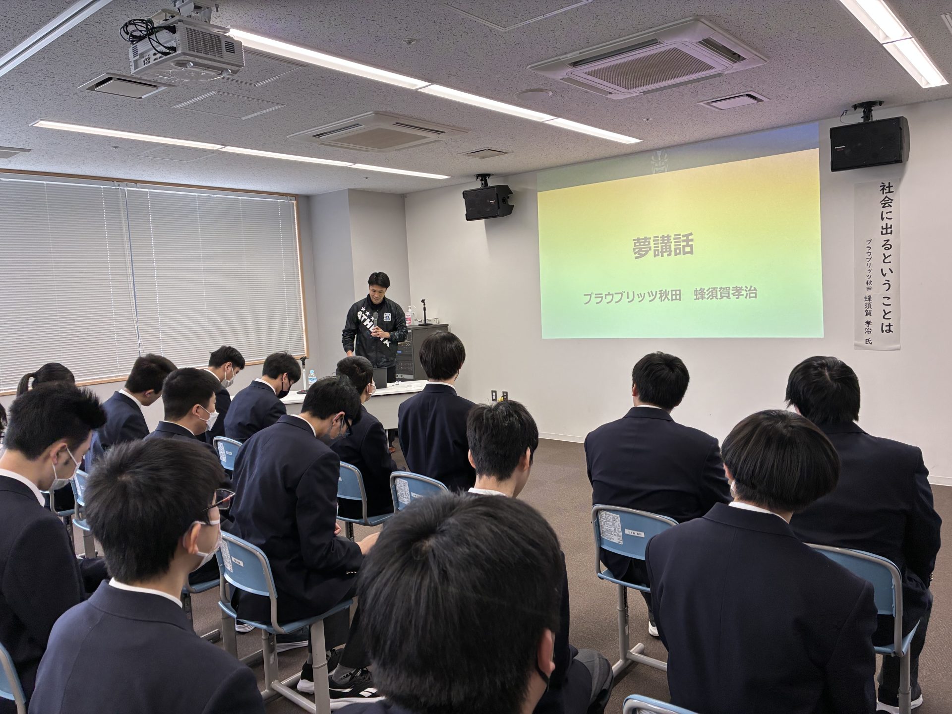 2月16日(月)、秋田県立比内支援学校にて、フロントスタッフの蜂須賀孝治が高等部を対象に夢講話を、中等部を対象にサッカー教室を実施しました。