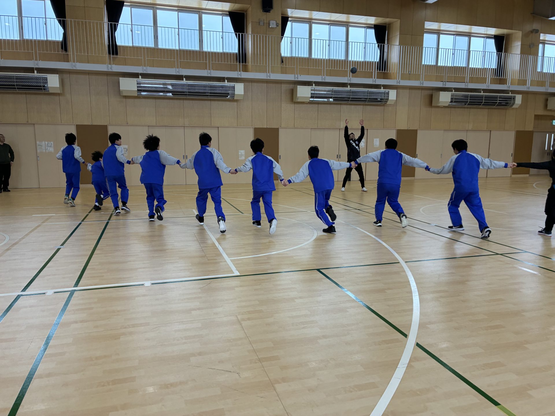 最初に、ボールを持っていない時しか生徒たちが動けないという特別ルールの「だるまさんがころんだ」を実施しました。