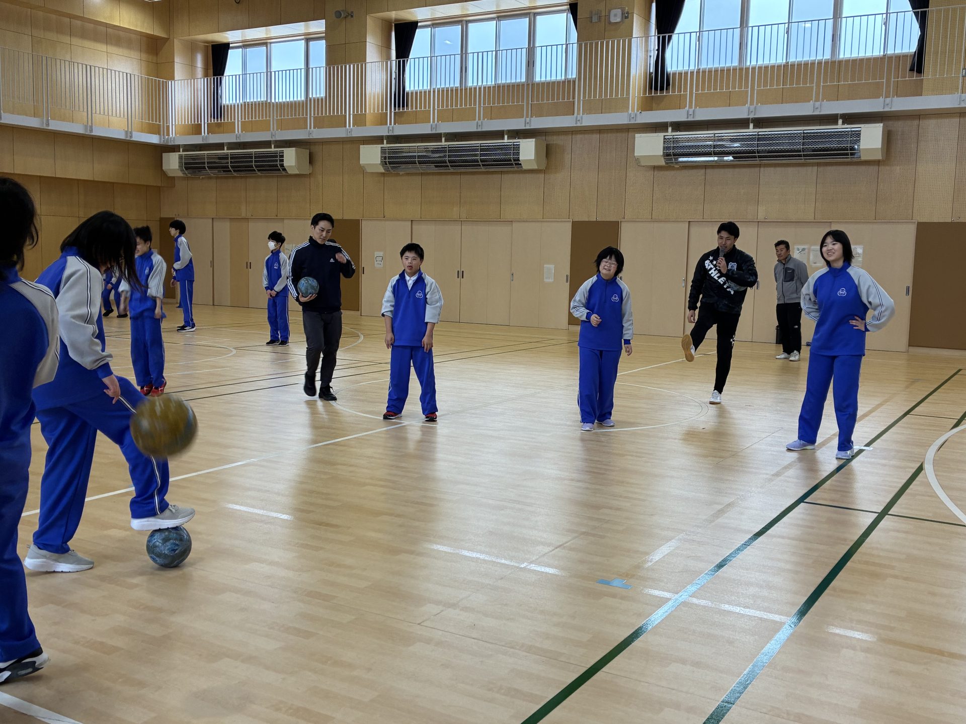 続いて、ボールを使ったパス、ドリブル、シュート練習を行いました。少しコツを伝えただけで、生徒たちは上手にボールを扱い、積極的にチャレンジする姿が見られました。