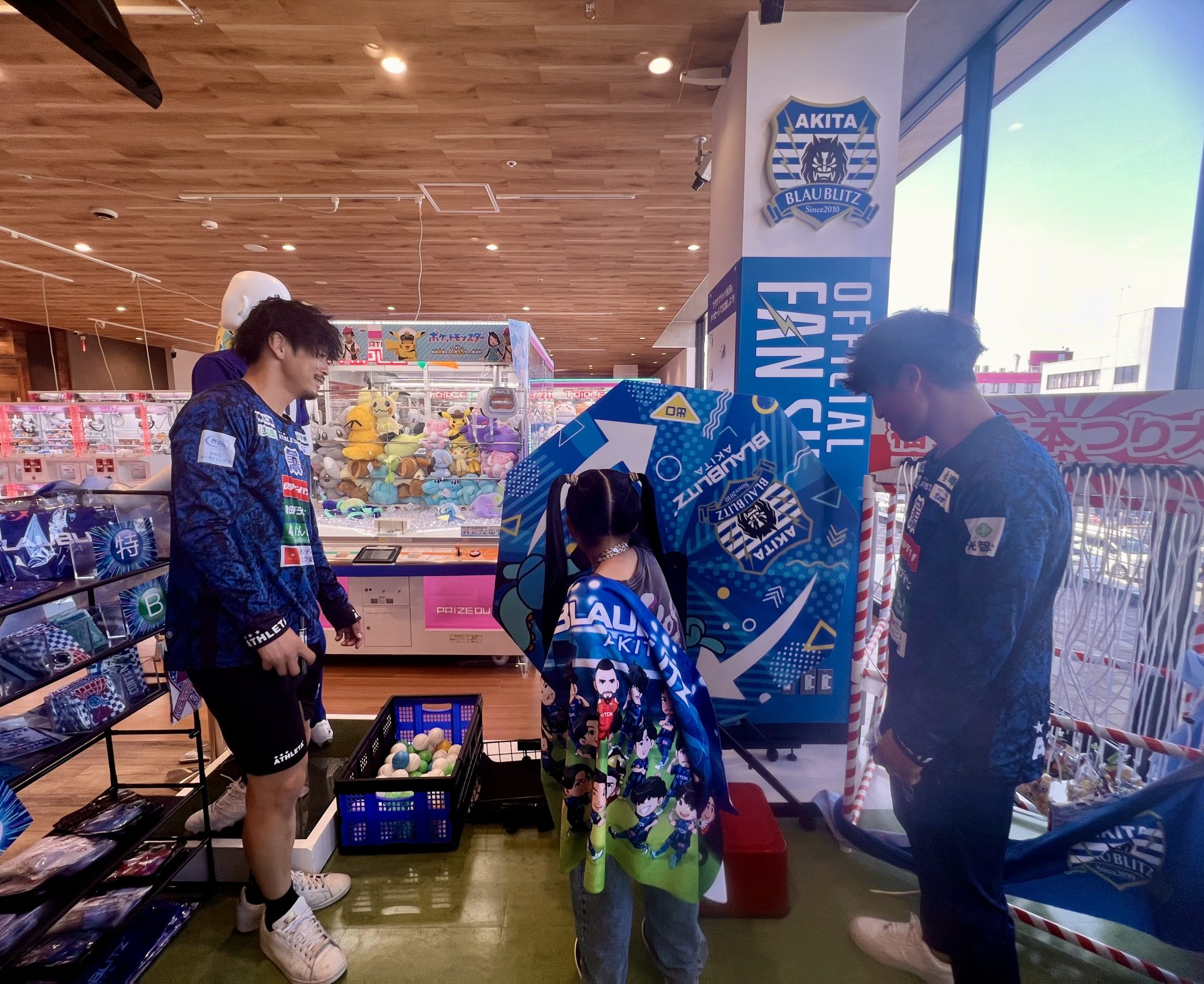 ブラウブリッツ秋田では、イオンスタイル山王2Fのブラウブリッツ秋田オフィシャルファンショップにて、グッズが当たる特大ガラポンや4日間限定商品の販売、選手・ブラウゴンの来店イベントを実施しました。