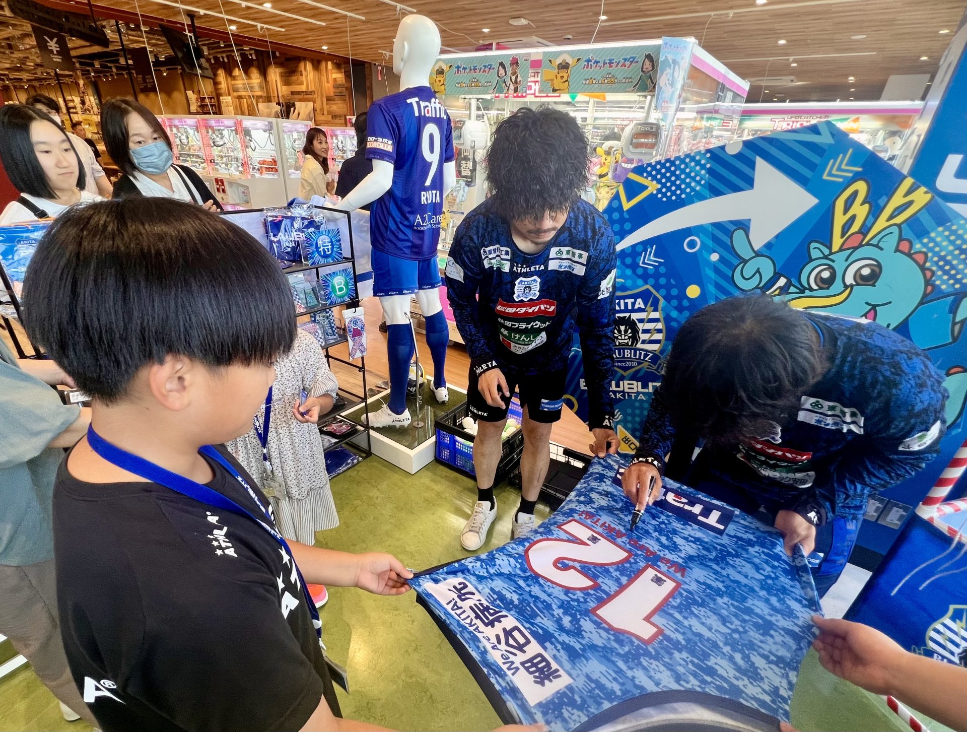 9月21日(日)には、FW8 畑潤基選手・MF25 藤山智史選手、ブラウゴンが来店し、来店してくださったファン・サポーターの皆様との交流や特大ガラポンを回してくださった方を対象に写真撮影・サインを行いました。
