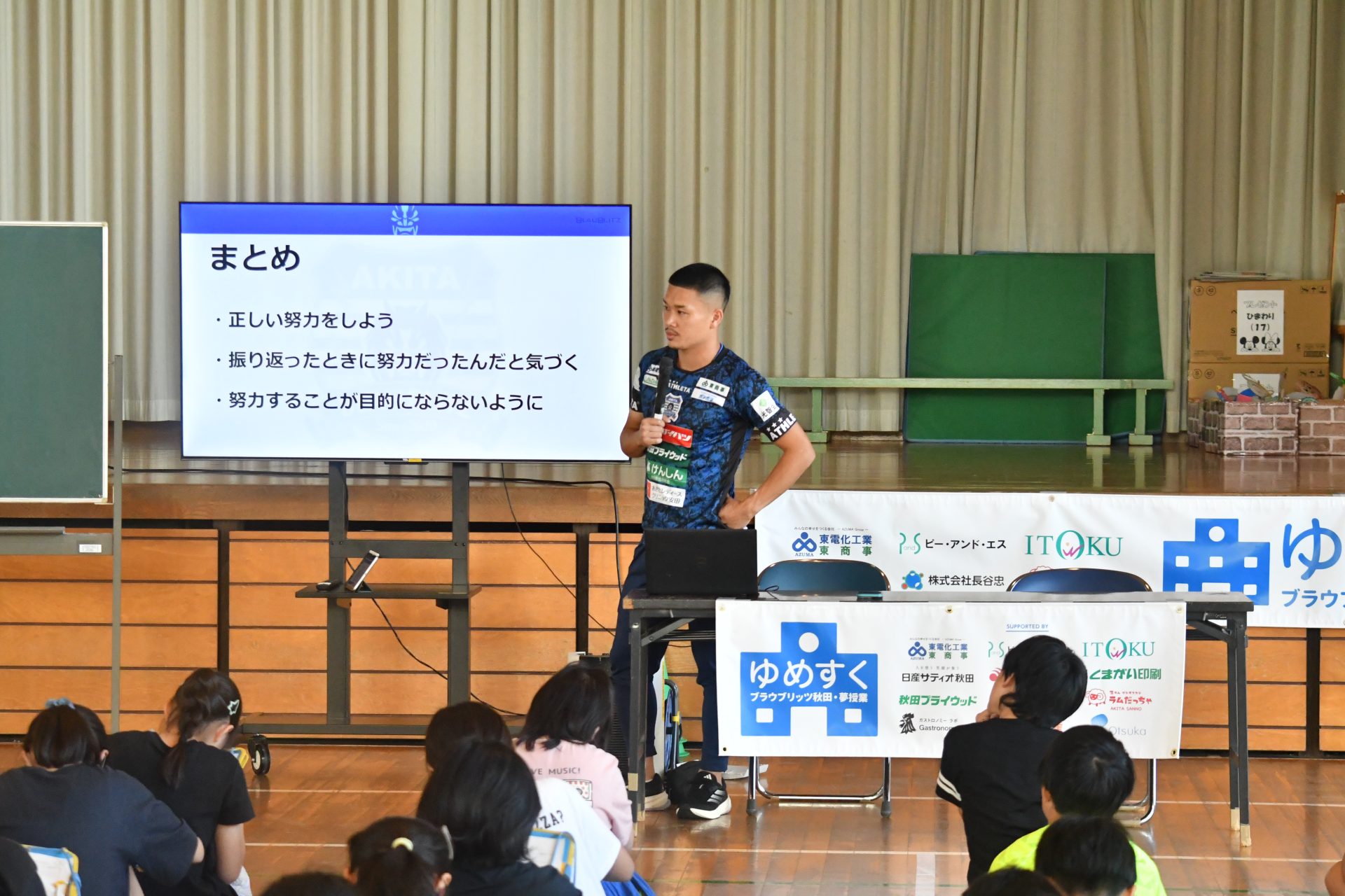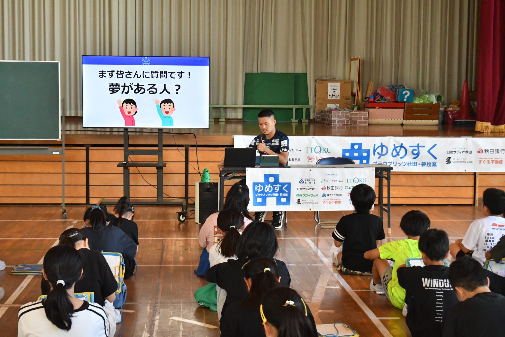 ブラウブリッツ秋田が、ホームタウン活動の一環として実施している「ゆめすく」は、ブラウブリッツ秋田の選手などが学校を訪問し、プロサッカー選手という夢を叶えた経緯を踏まえ「夢を持つことの大切さ」「夢を追いかけることの重要性」を伝える活動です。