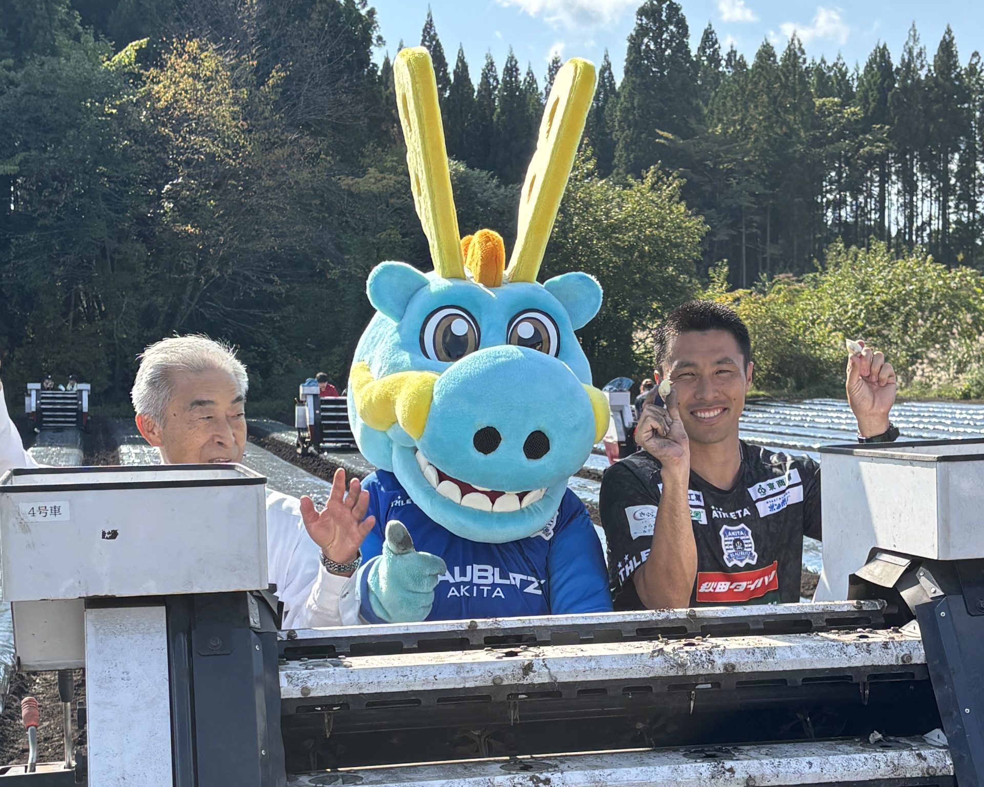 本事業は秋田県信用組合さまが職員の皆さまを対象に、地域貢献活動と農業体験研修、新入社員研修を兼ねた事業として、にんにくの植え付け及び収穫を行っており、ブラウブリッツ秋田は2022年度より共に活動しています。今年はフロントスタッフの蜂須賀孝治が初めて参加しました。
