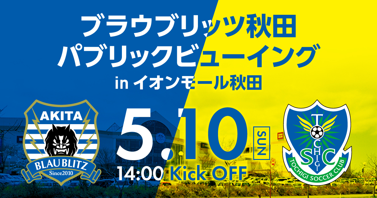 この度、5月10日(日) 14時キックオフ、明治安田百年構想リーグ第16節「栃木SC vs ブラウブリッツ秋田」について、イオンモール秋田にてパブリックビューイングを開催することとなりましたので、お知らせいたします。