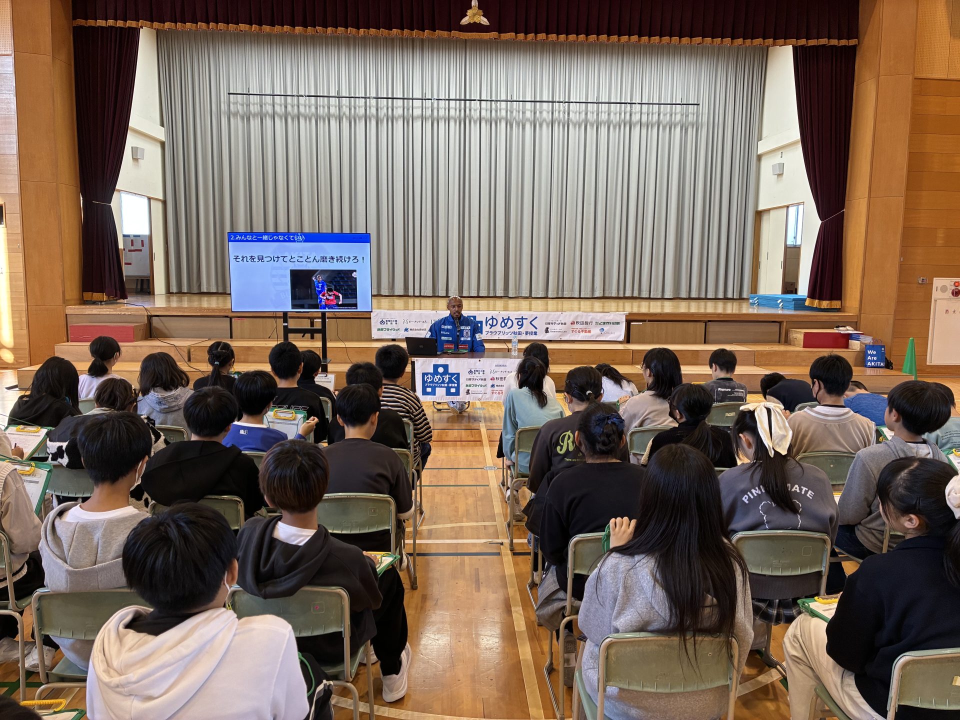 ブラウブリッツ秋田が、ホームタウン活動の一環として実施している「ゆめすく」は、ブラウブリッツ秋田の選手などが学校を訪問し、プロサッカー選手という夢を叶えた経緯を踏まえ「夢を持つことの大切さ」「夢を追いかけることの重要性」を伝える活動です。