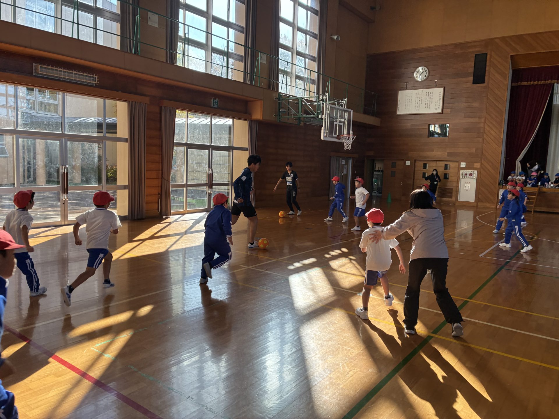 今回のゆめすくは、対象が小学2年生ということで、夢についての講話ではなく、アカデミーコーチ2名の協力も得て、サッカー教室を実施しました。