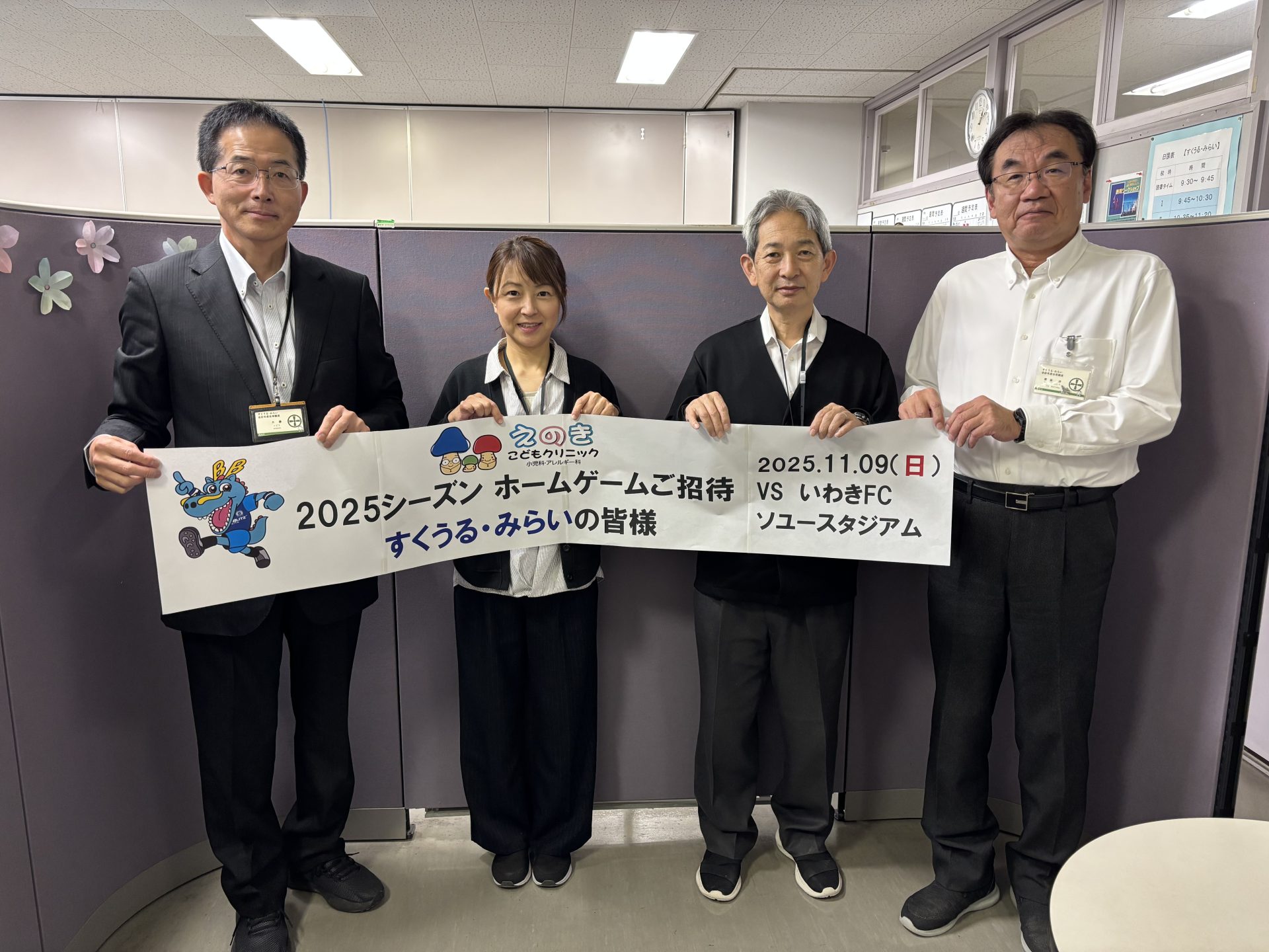 11月9日(日)開催の「2025明治安田生命J2リーグ第36節 TSAグループ Presents ブラウブリッツ秋田 vs いわきFC」におきまして、えのきこどもクリニックさまより、教育支援センター「すくうる・みらい」に通級されている皆さまをご招待いただきました。