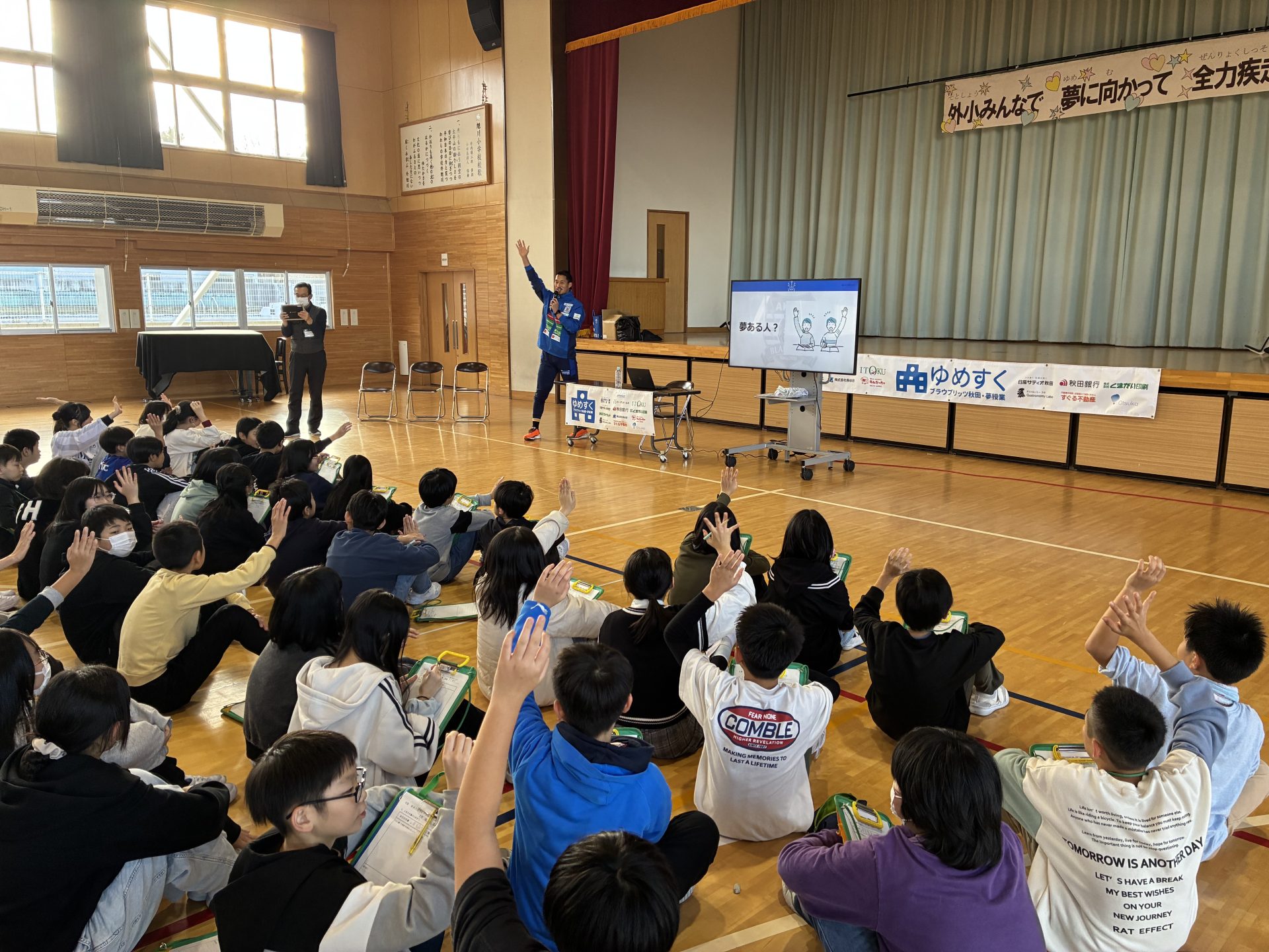 「夢がある人?」という質問に、児童たちは「プロバスケットボール選手になりたい!」や「システムエンジニアになりたい!」など、多種多様な夢を発表していました。