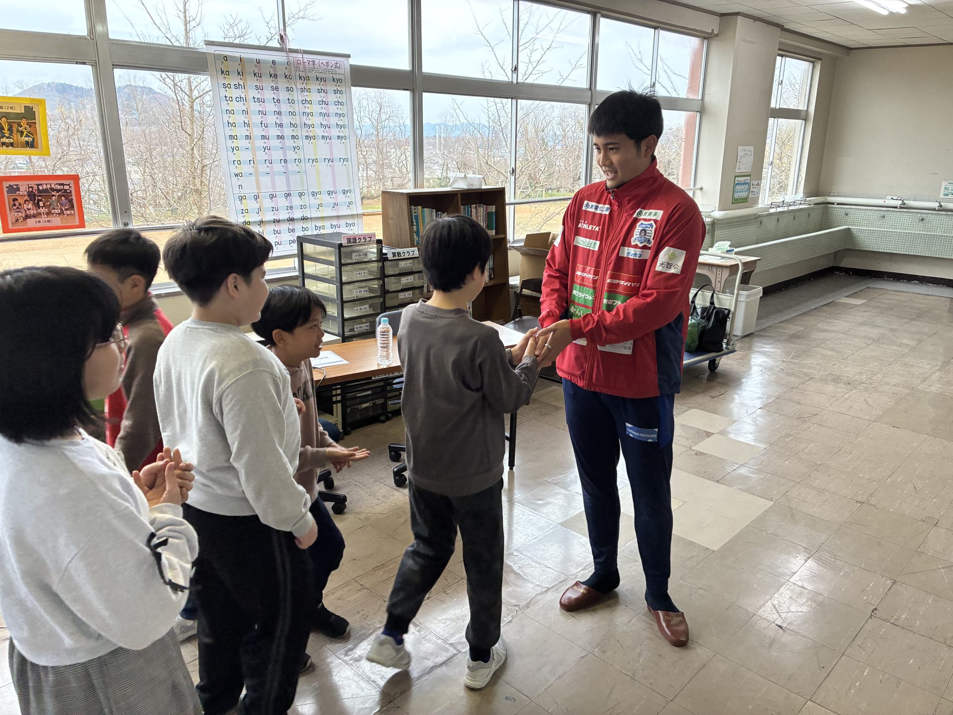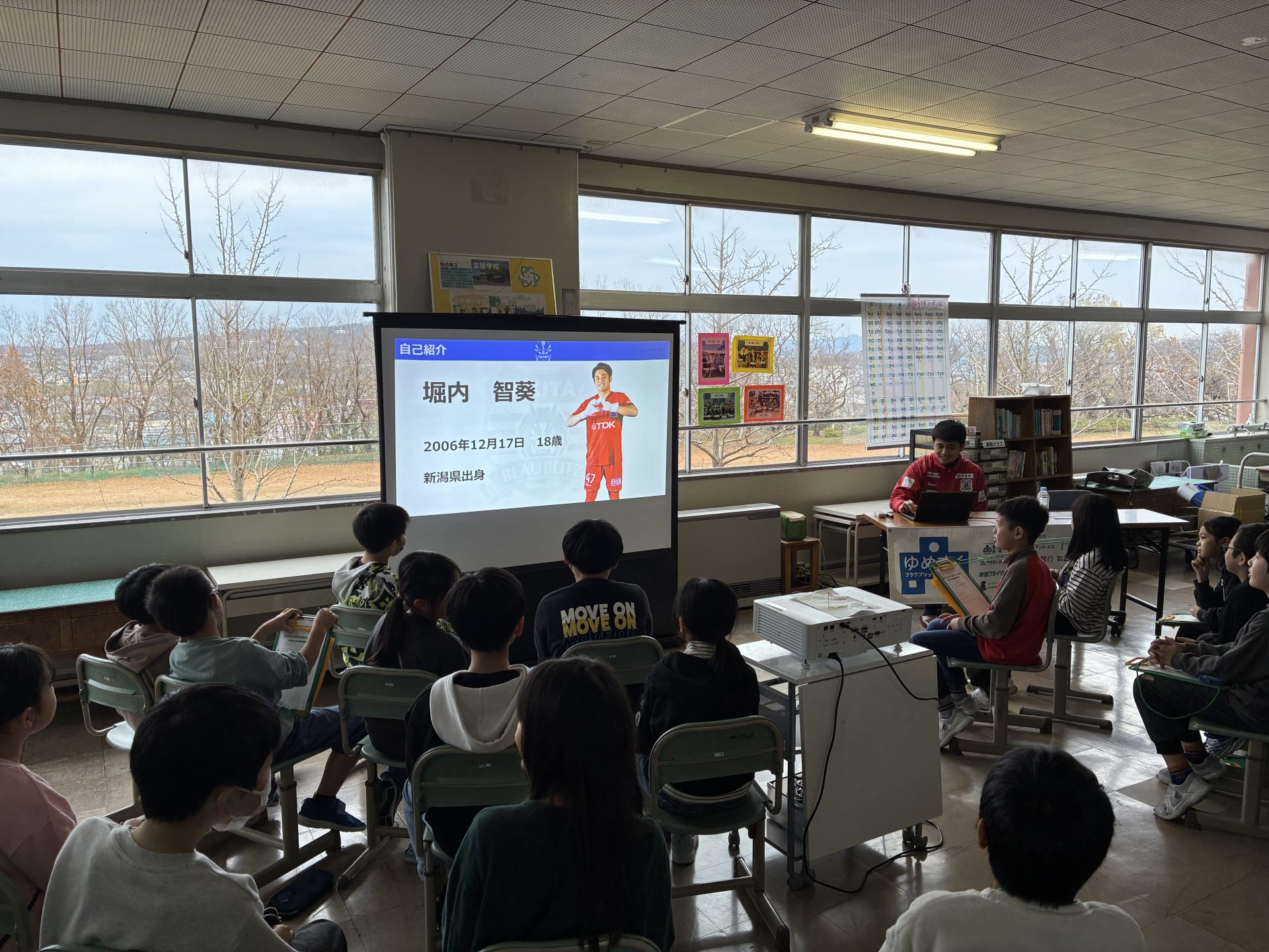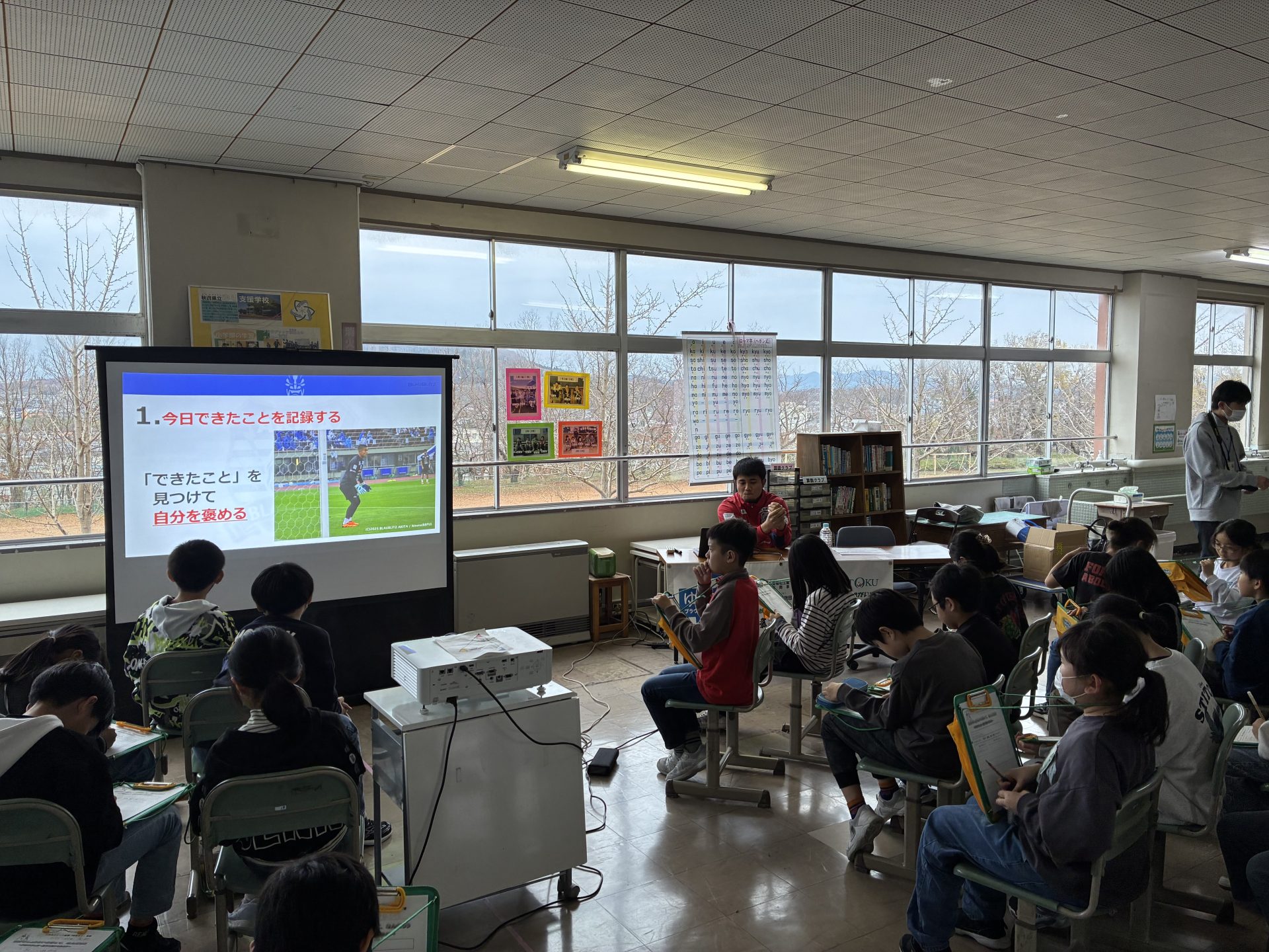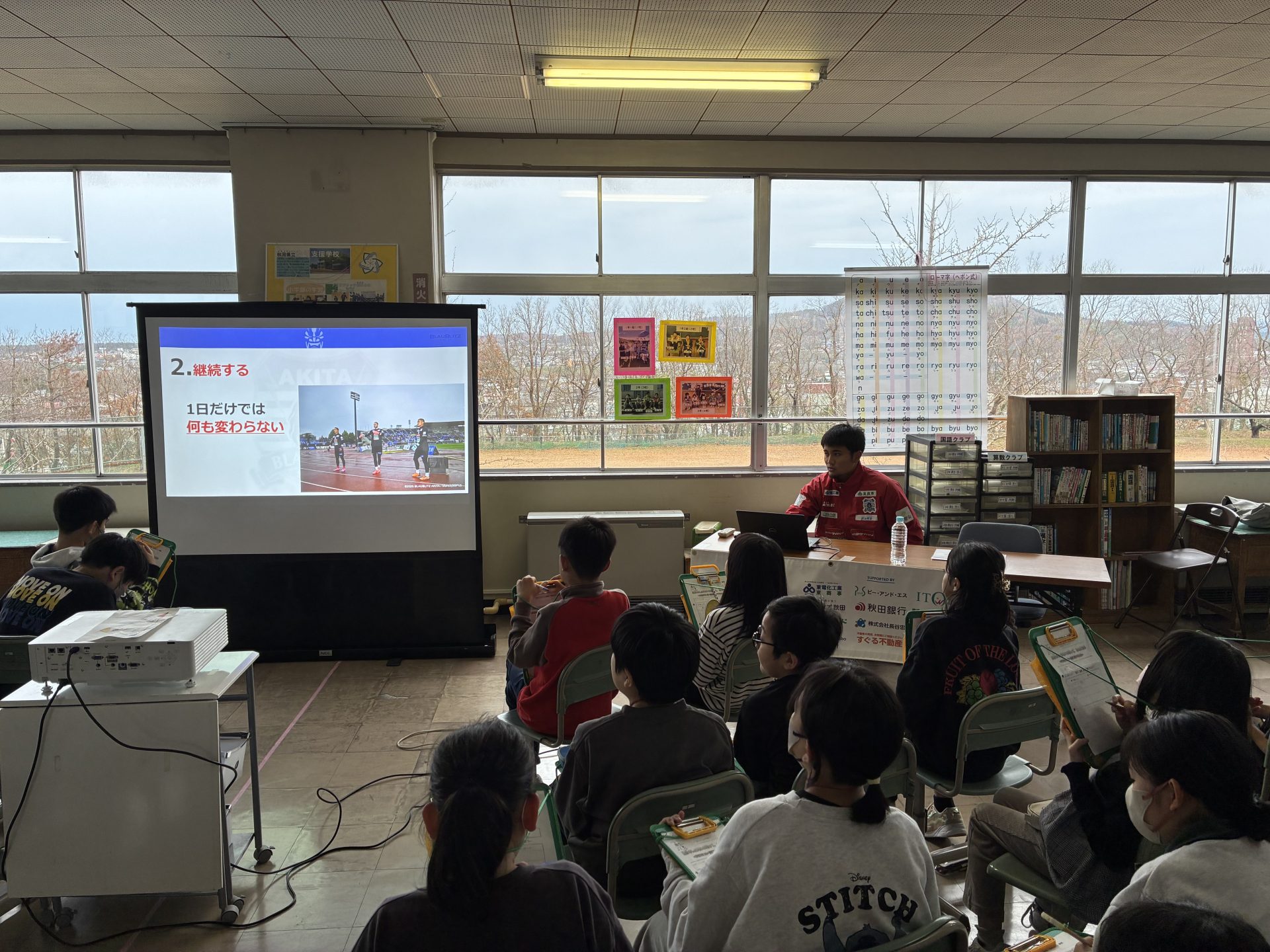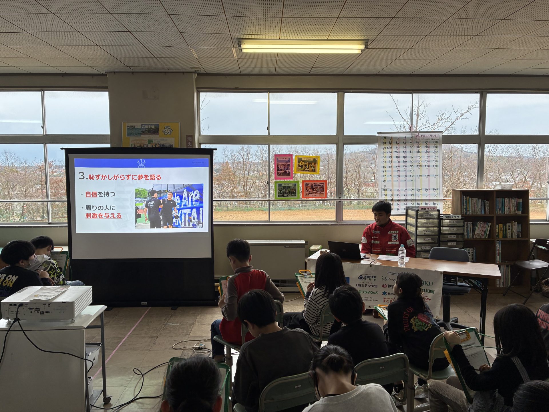 11月25日(火)、由利本荘市立鶴舞小学校の4年生69名を対象に、GK47 堀内智葵選手が「ゆめすく」を行いました。