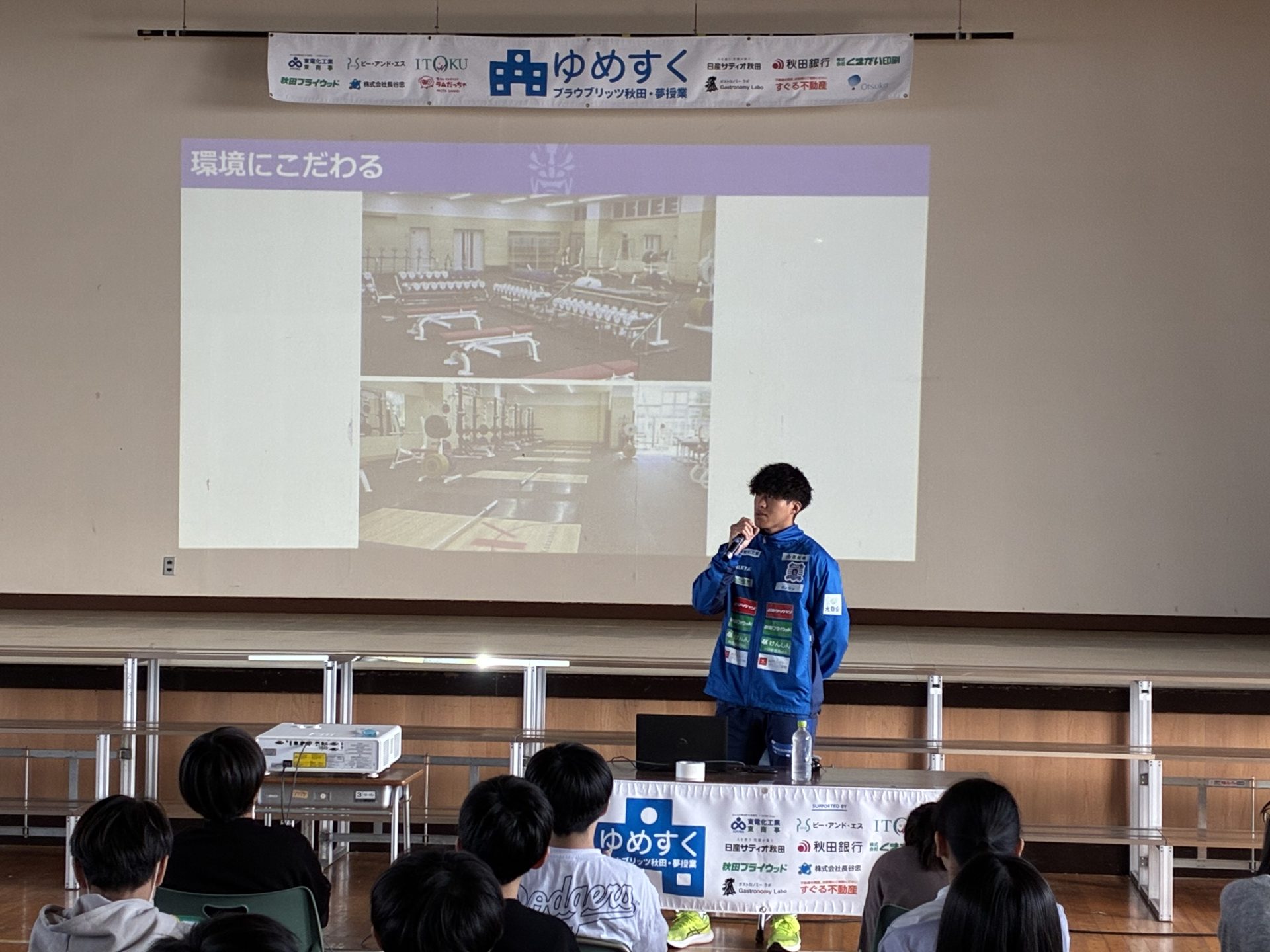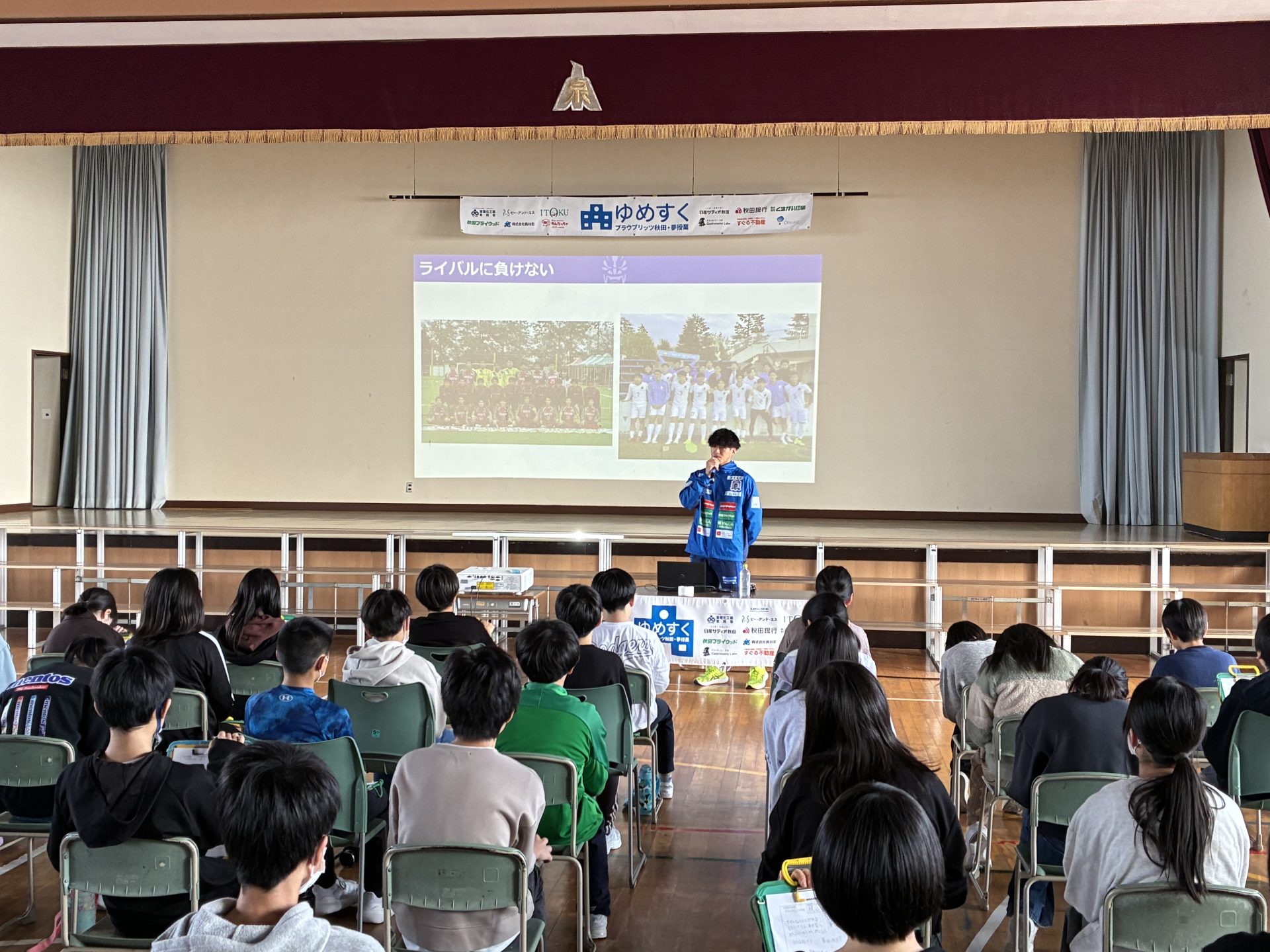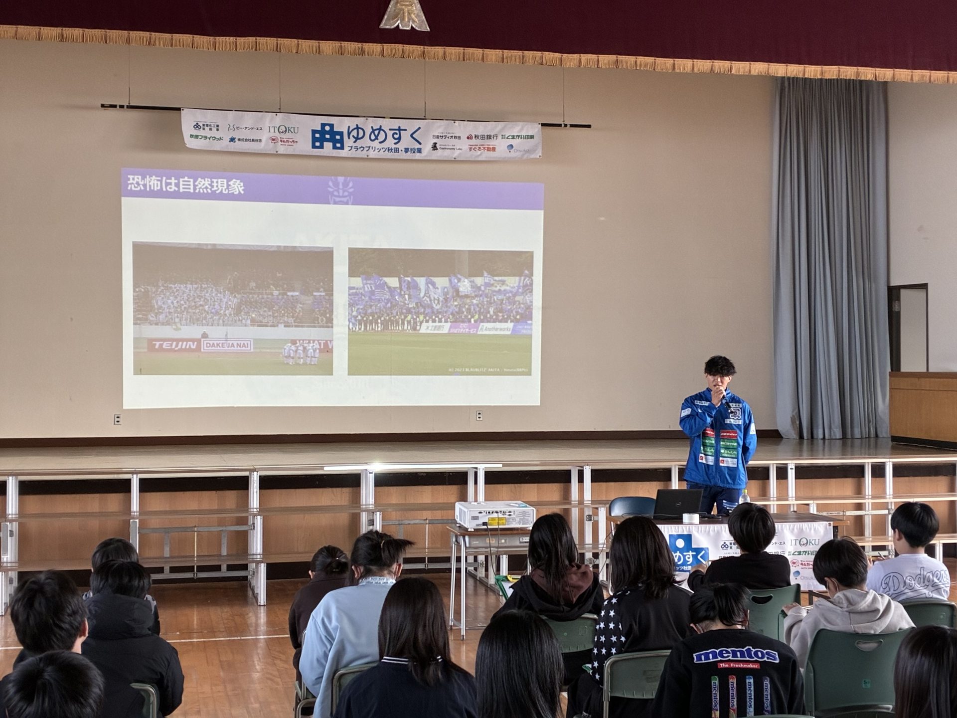 ブラウブリッツ秋田が、ホームタウン活動の一環として実施している「ゆめすく」は、ブラウブリッツ秋田の選手などが学校を訪問し、プロサッカー選手という夢を叶えた経緯を踏まえ「夢を持つことの大切さ」「夢を追いかけることの重要性」を伝える活動です。