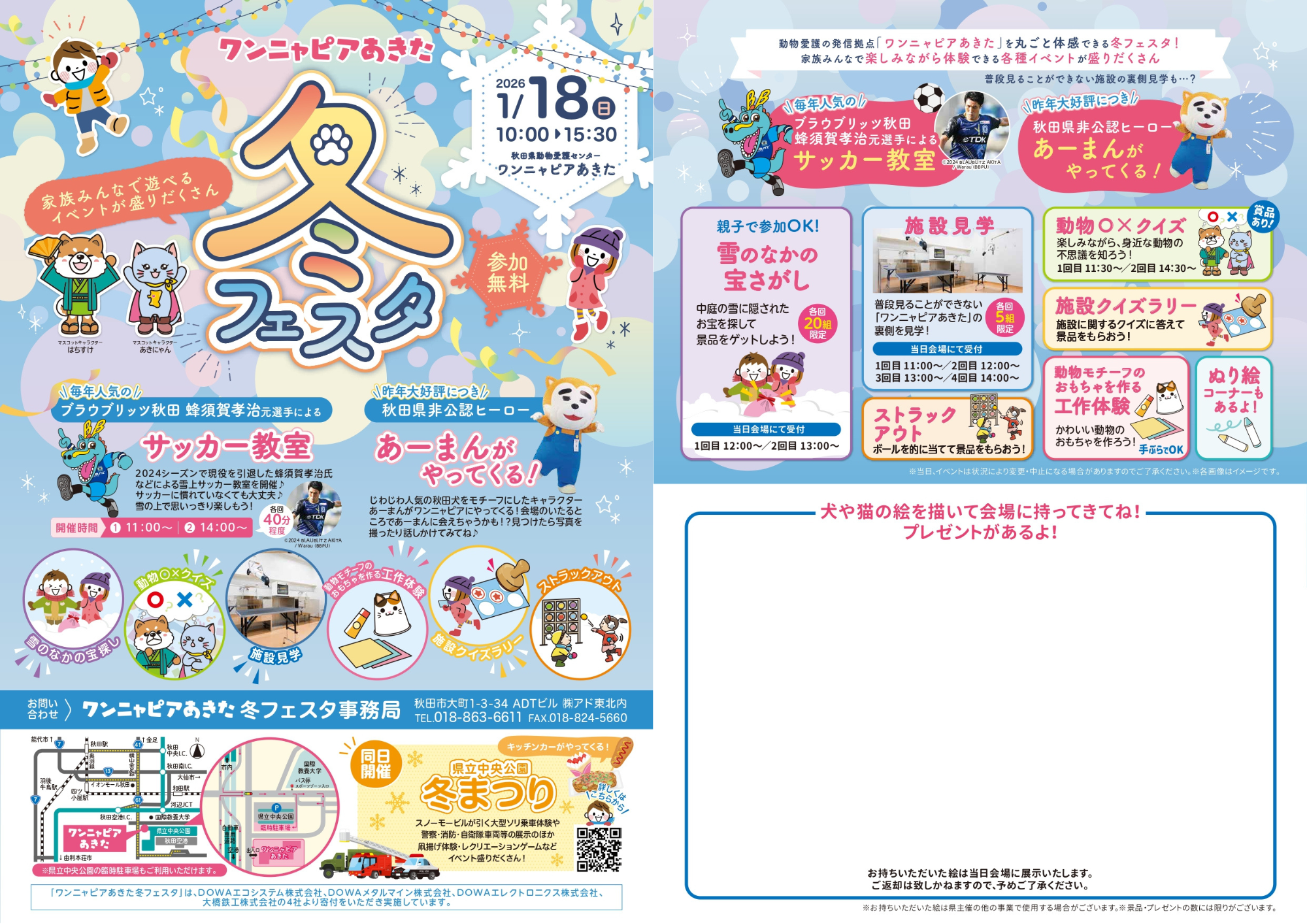 1月18日(日)、秋田県動物愛護センターワンニャピアあきたで行われる「ワンニャピアあきた 冬フェスタ2026」にブラウゴン、フロントスタッフの蜂須賀孝治が参加することとなりましたのでお知らせいたします。