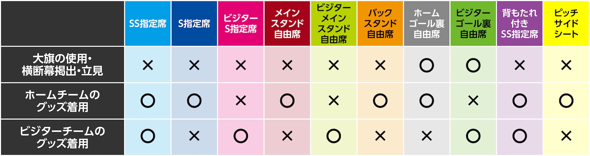 席種によって着用できるユニフォームやグッズ、応援の仕方が異なっております。