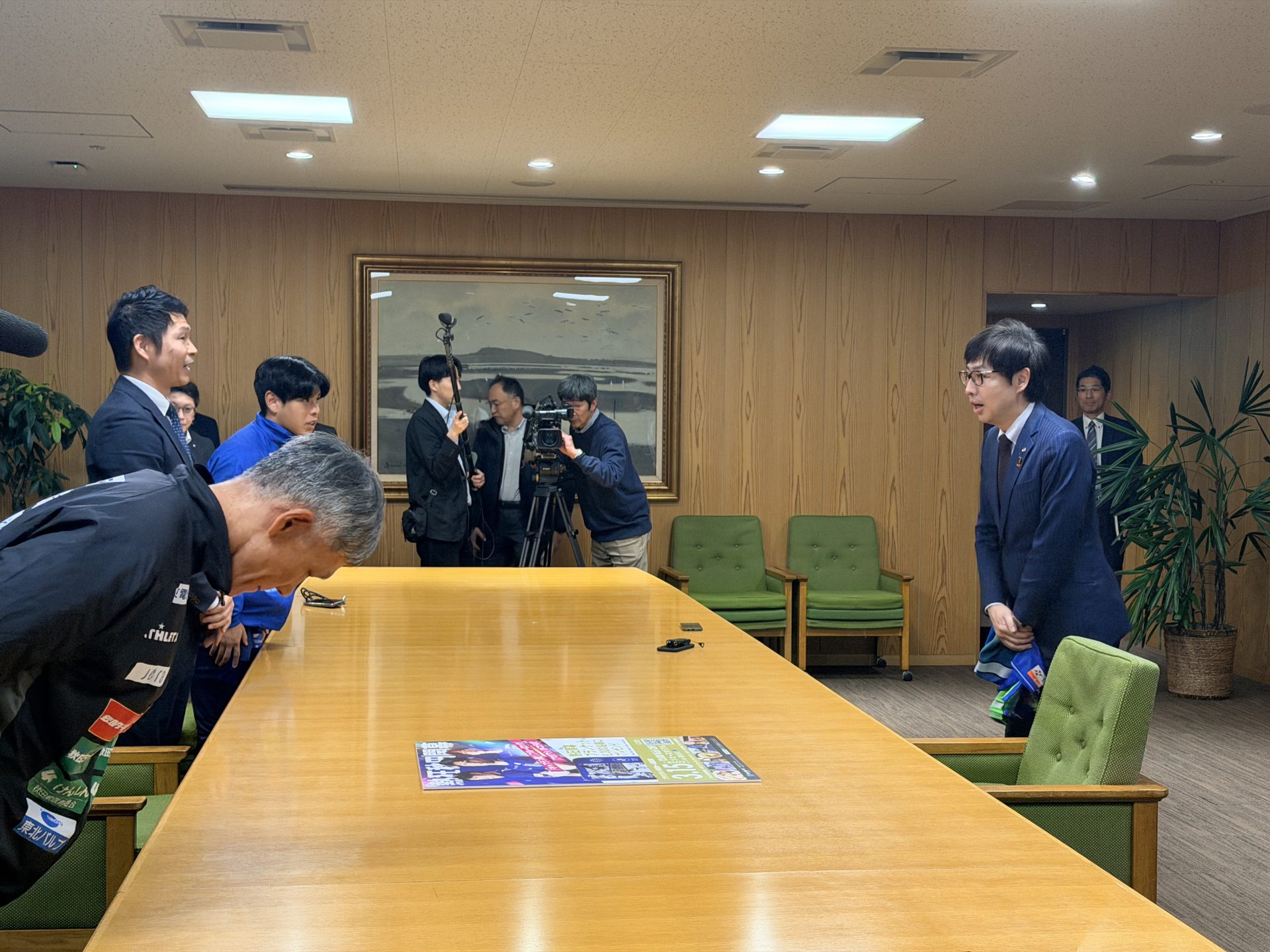 沼谷純秋田市長からは「5戦を4勝1敗、10チーム中2位。本当に素晴らしい戦いをニュースなどで見ました。アウェイ戦続く中で4勝1敗でホーム開幕を迎えるっていうのはなかなかできない。本当に素晴らしいことだと思っています。ぜひホームがこの後3連戦となりますが、良い結果を出していただければ、市民・県民の皆さんの議論も大いに盛り上がると思いますし、我々もそれを大いに願っています。」と激励のお言葉をいただきました。