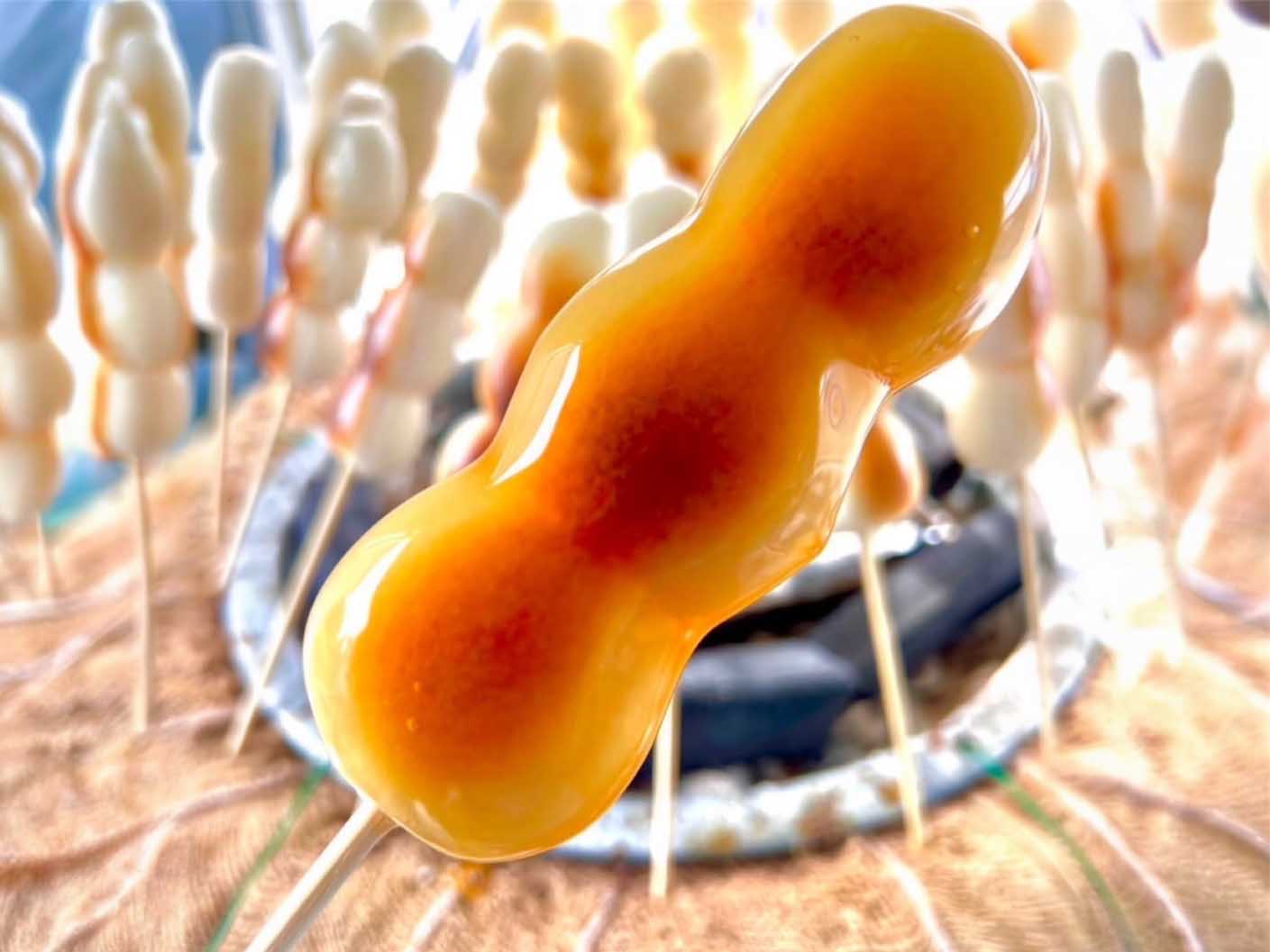国産うるち米100%のお団子を大きな藁にびっしりと刺し詰めて、炭火でじっくり焼き上げた本格炭火焼きだんご専門店「甘味処ぷー太郎」さん!