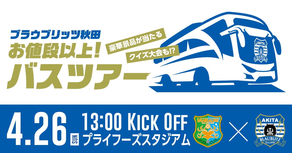 4月26日(日) 13時キックオフの「明治安田J2・J3百年構想リーグ第12節 ヴァンラーレ八戸 vs ブラウブリッツ秋田」において「お値段以上バスツアー」を実施することが決定いたしましたのでお知らせいたします。