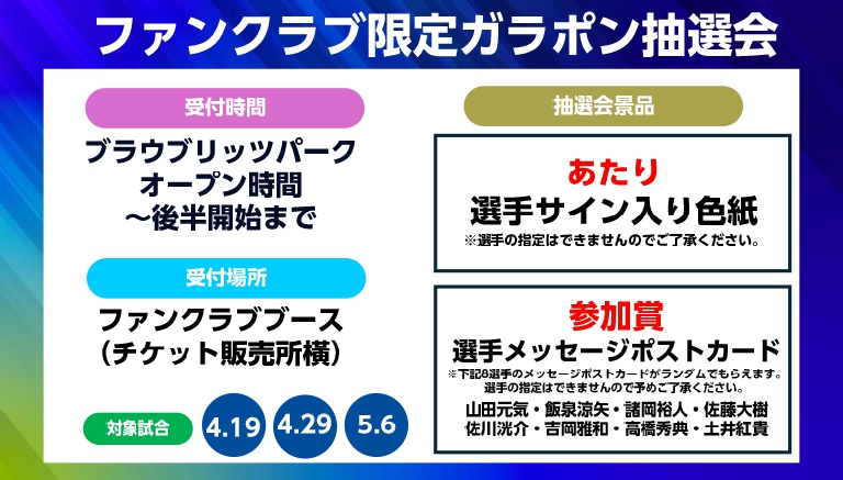 - ガラポン抽選会は「春のファンまつり」対象試合となる3試合で実施します。
