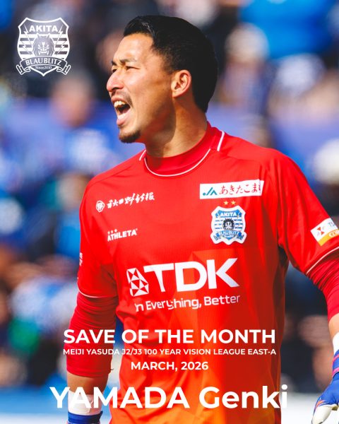 各月の明治安田Jリーグ百年構想リーグにおいて、最も優れたセーブを表彰する「明治安田Jリーグ百年構想リーグ 月間ベストセーブ」の3月度の受賞セーブが決定し、明治安田J2・J3百年構想リーグEAST-Aにおいて、GK1 山田元気選手が受賞いたしましたのでお知らせします。