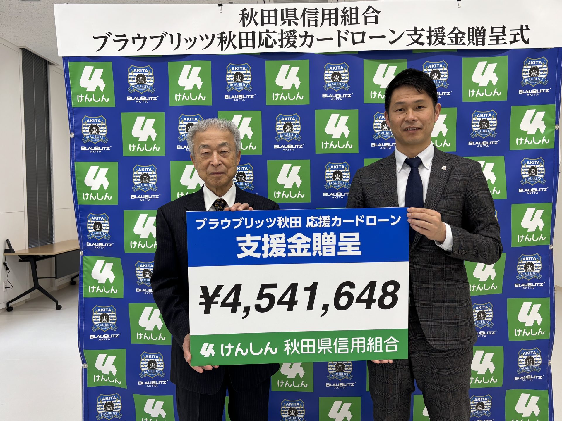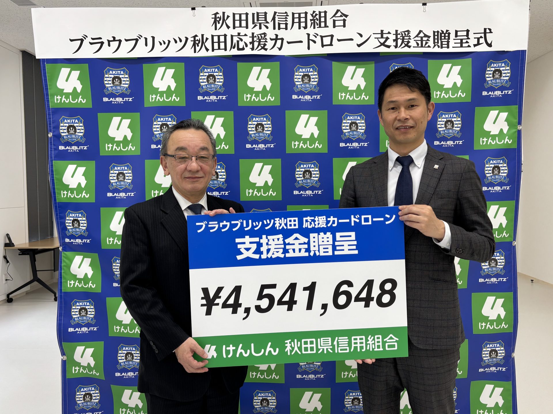 4月9日(木)、秋田県信用組合本店にて、秋田県信用組合様より「ブラウブリッツ秋田応援カードローン」の支援金4,541,648円を贈呈いただきました。