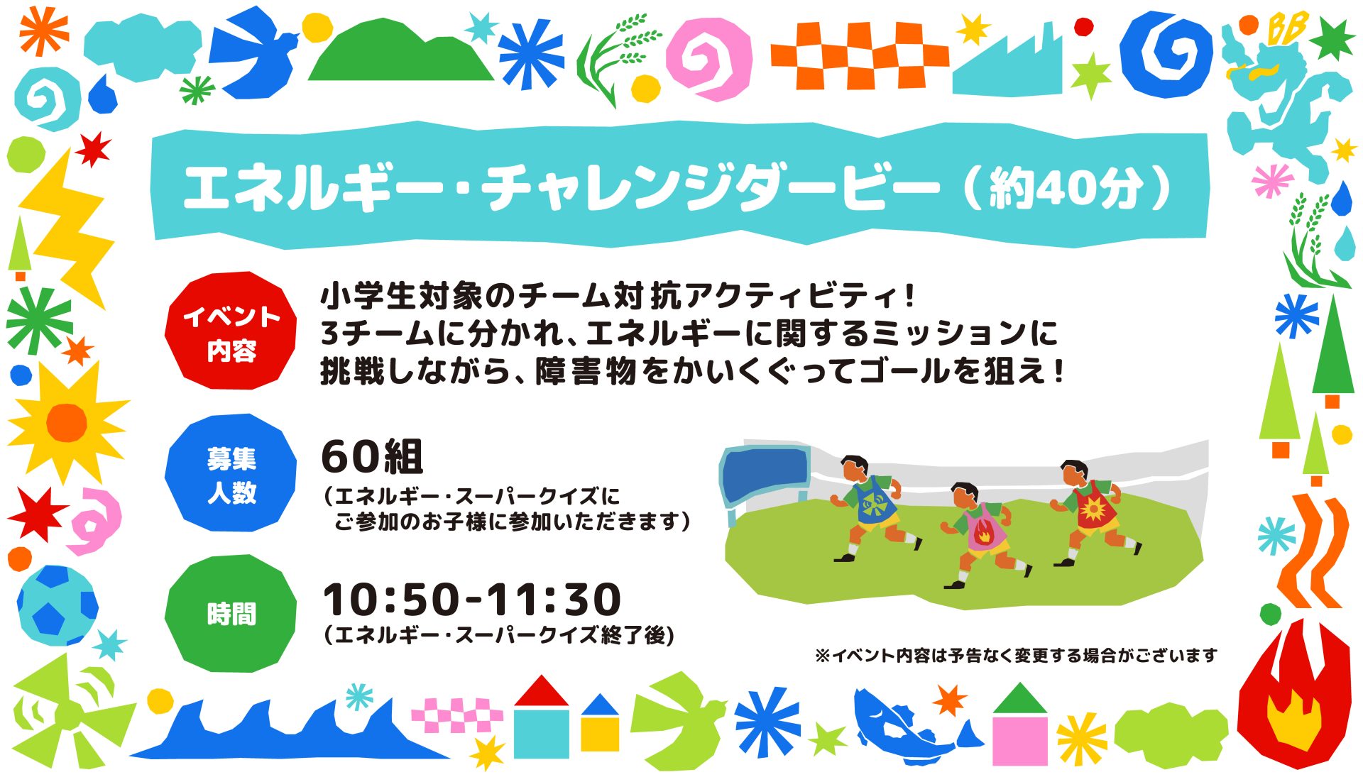 試合当日はサステナブルをテーマに「でんきげんきスクール」を実施いたします。でんきげんきスクールは、JERAとブラウブリッツ秋田の選手がナビゲーターとなって、スタジアムのピッチを舞台に、体を使いながら楽しくエネルギーについて学んでいただける限定の体験型イベントです!さらに、参加者全員を、当日の試合観戦にご招待します。