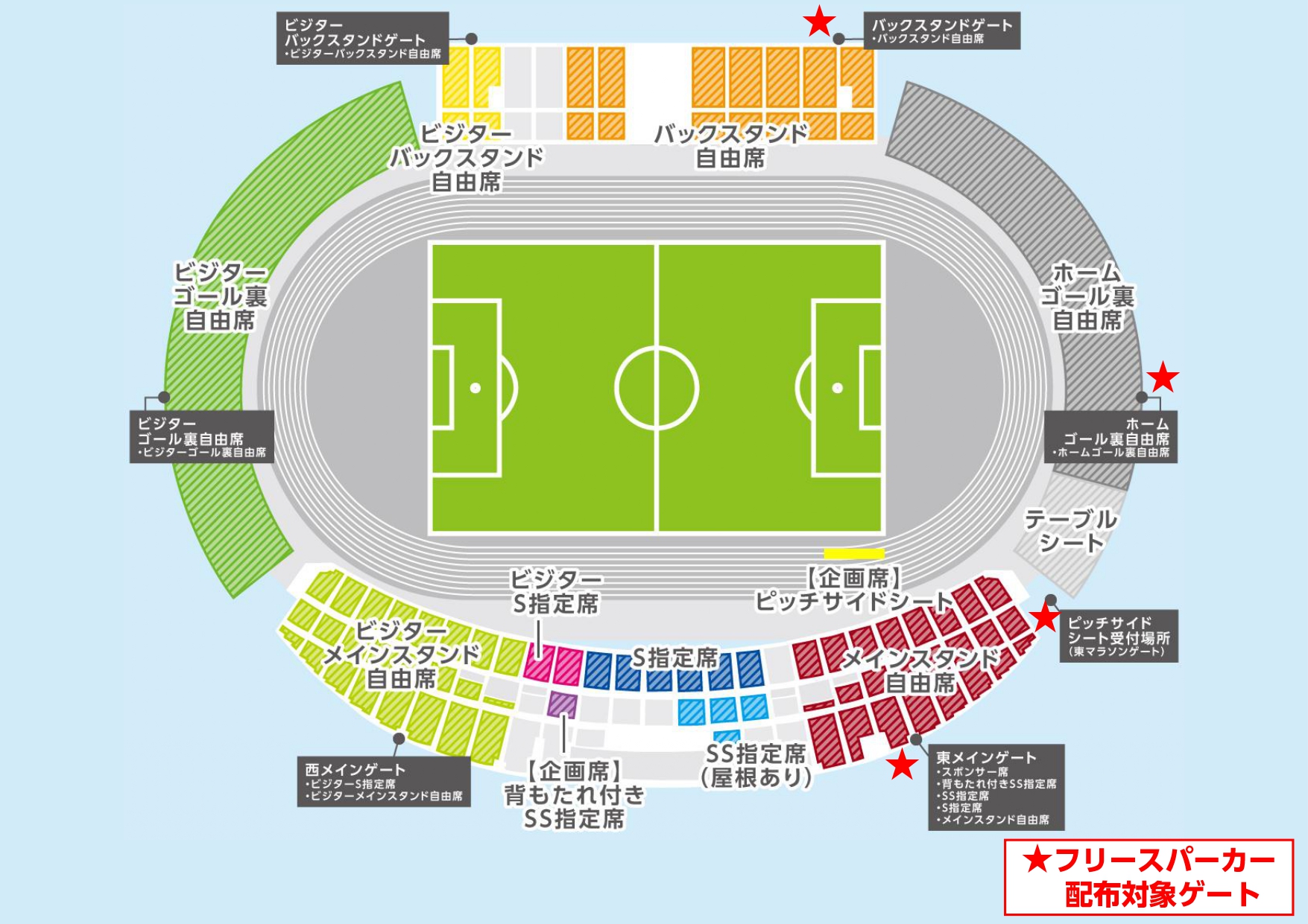 ※西メインゲート・ビジターバックスタンドゲート・ビジターゴール裏自由席ゲートでは「フリースパーカー」の配布はいたしませんので、あらかじめご了承ください。