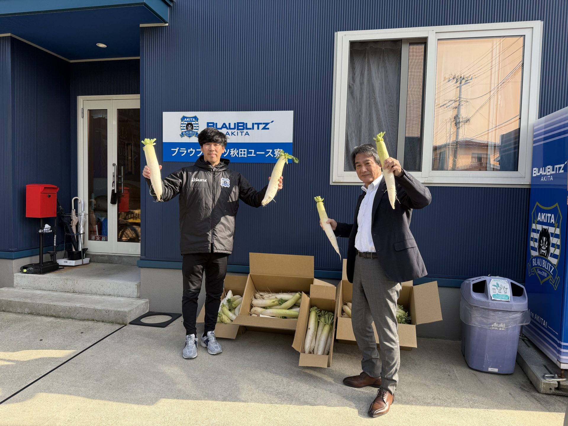 12月2日(火)、トレーニングユニフォームスポンサーの秋田ダイハツ販売株式会社さまより、ブラウブリッツ秋田ユース寮の選手へ自社で栽培した無農薬の大根を贈呈いただきました。