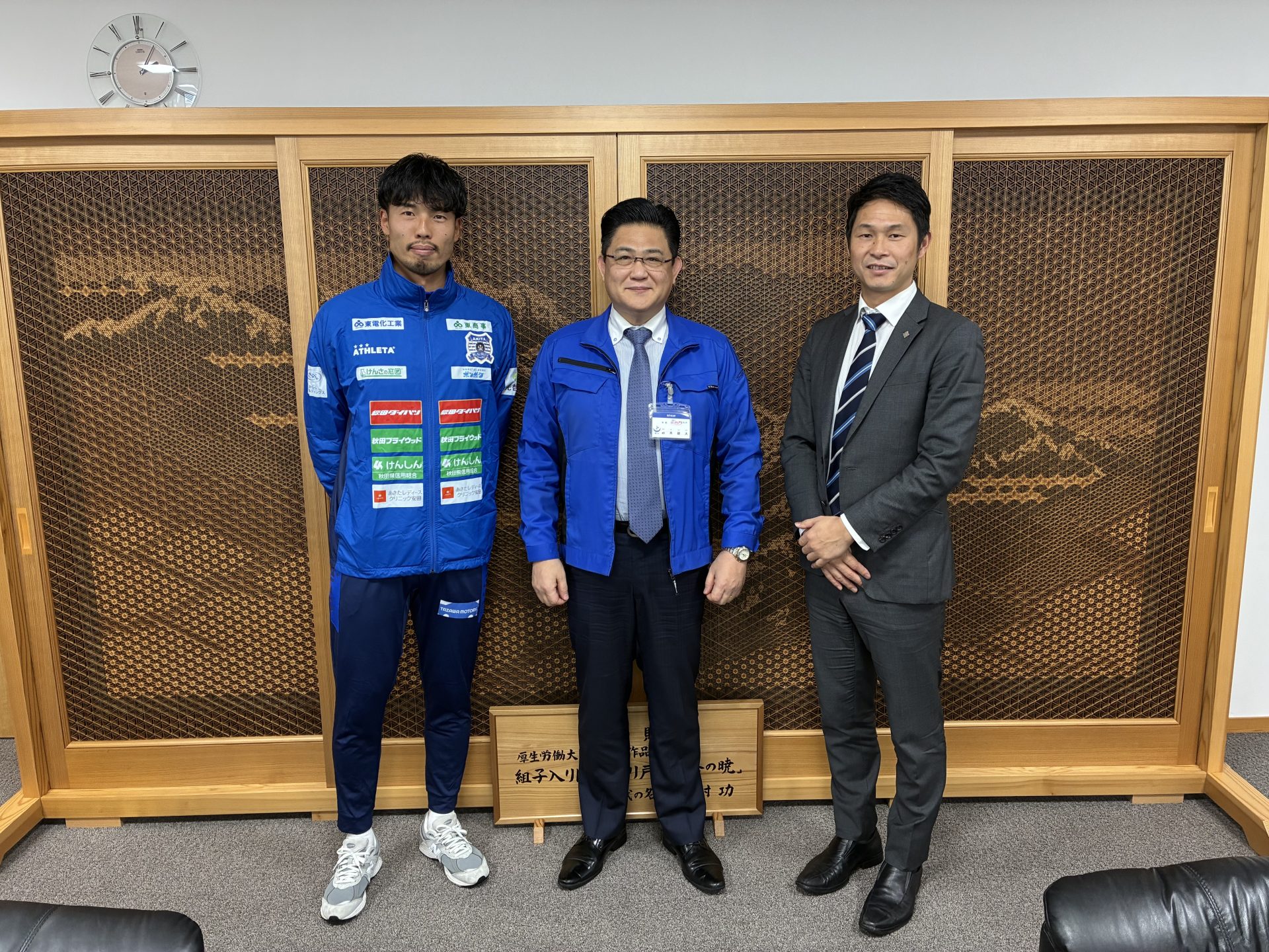 12月12日(金)、岩瀬浩介代表取締役社長、DF2 岡﨑亮平選手が2025シーズン終了のご報告のため、鈴木雄大潟上市長を表敬訪問しました。