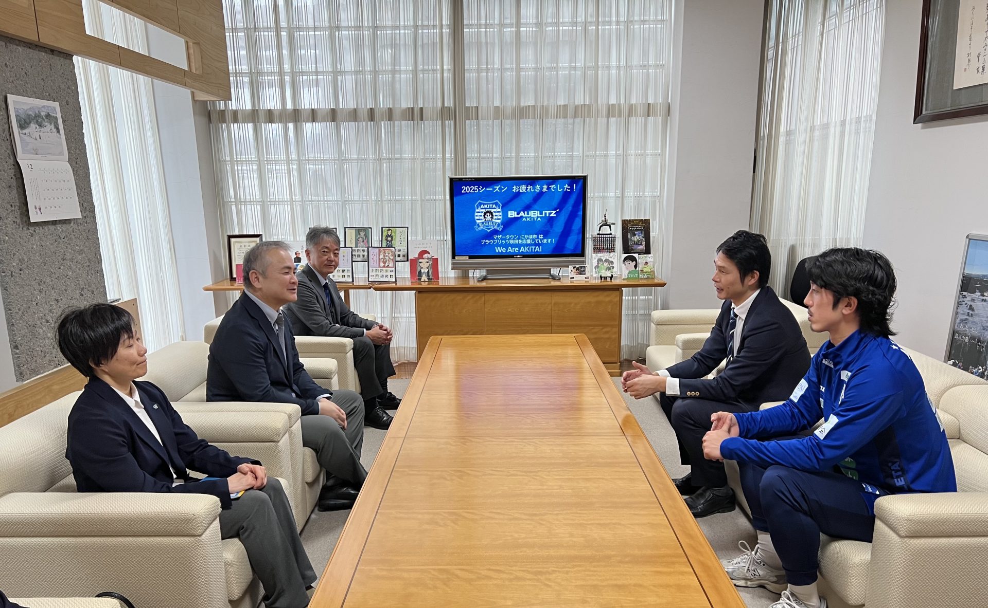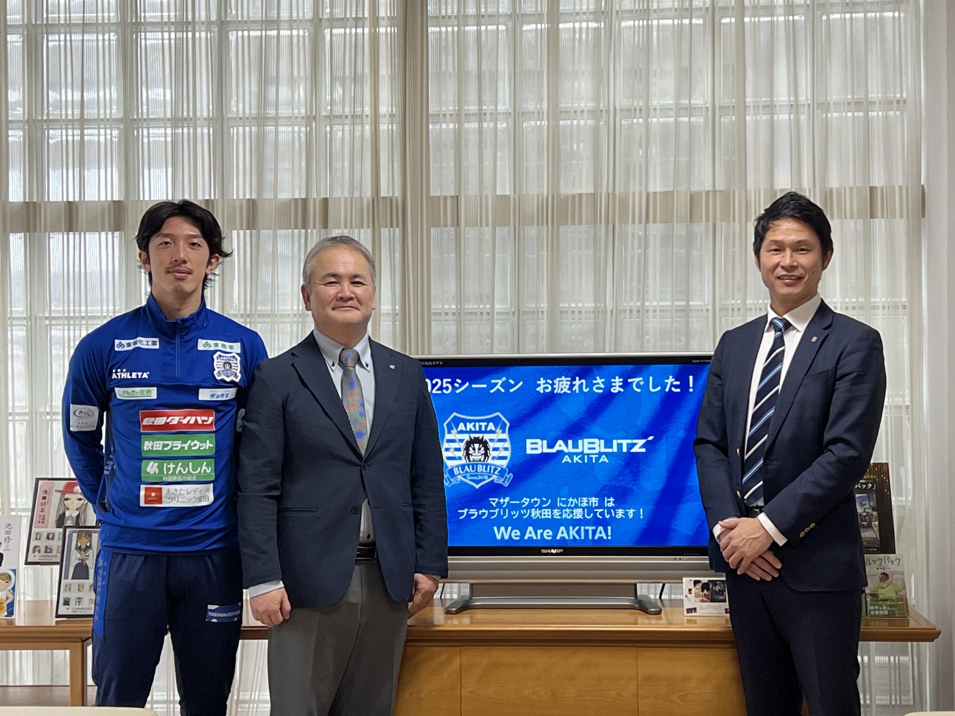 12月24日(水)、岩瀬浩介代表取締役社長、DF30 飯泉涼矢選手が2025シーズン終了のご報告のため、市川雄次にかほ市長を表敬訪問しました。