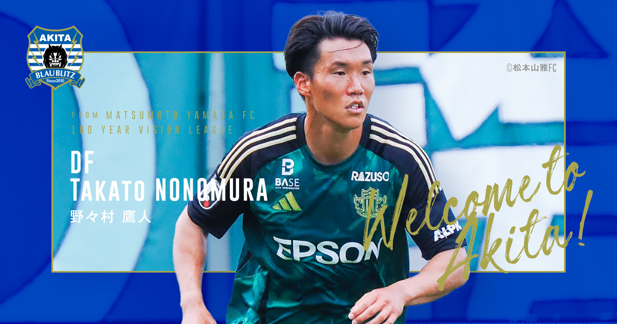 この度、松本山雅FCの野々村鷹人選手がブラウブリッツ秋田へ完全移籍で加入することとなりましたので、お知らせいたします。